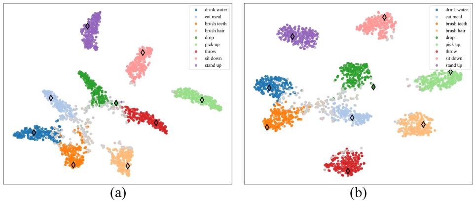 Figure 2 illustrates a qualitative t-SNE visualization comparing the GAP model with the proposed PCLE model. The skeleton embeddings are shown as dots, while the text embeddings are represented as diamonds. The samples belonging to the same class are indicated by the same color, and the misclassified samples are illustrated in gray. Regarding the GAP model, which lacks skeleton-language interaction, the clusters formed by each class lack distinctiveness. On the contrary, with the incorporation of skeleton-language interaction in the proposed PCLE model, the separation between classes becomes well-defined and distinct.