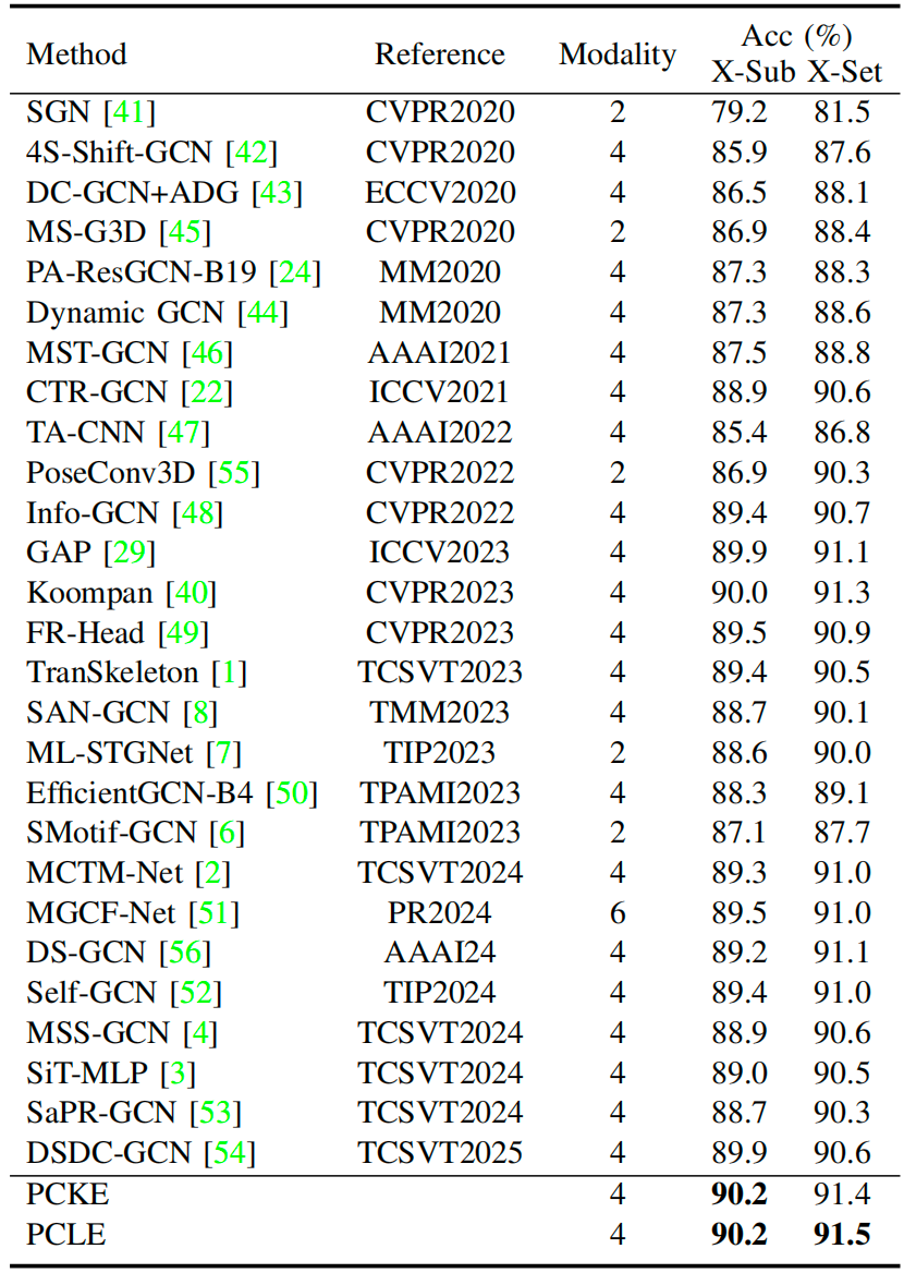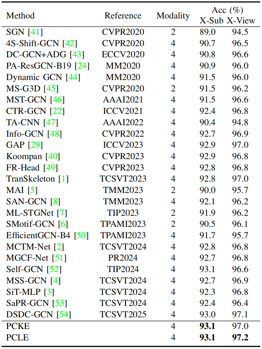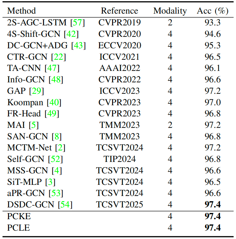 The comparison results of the proposed method and state-of-the-art methodson the NTU RGB+D, NTU RGB+D 120, and NW-UCLA datasets are shown in Tables 1-3. Overall, the proposed model achieves state-of-the-art performance, demonstrating its superiority over state-of-the-artmethods.