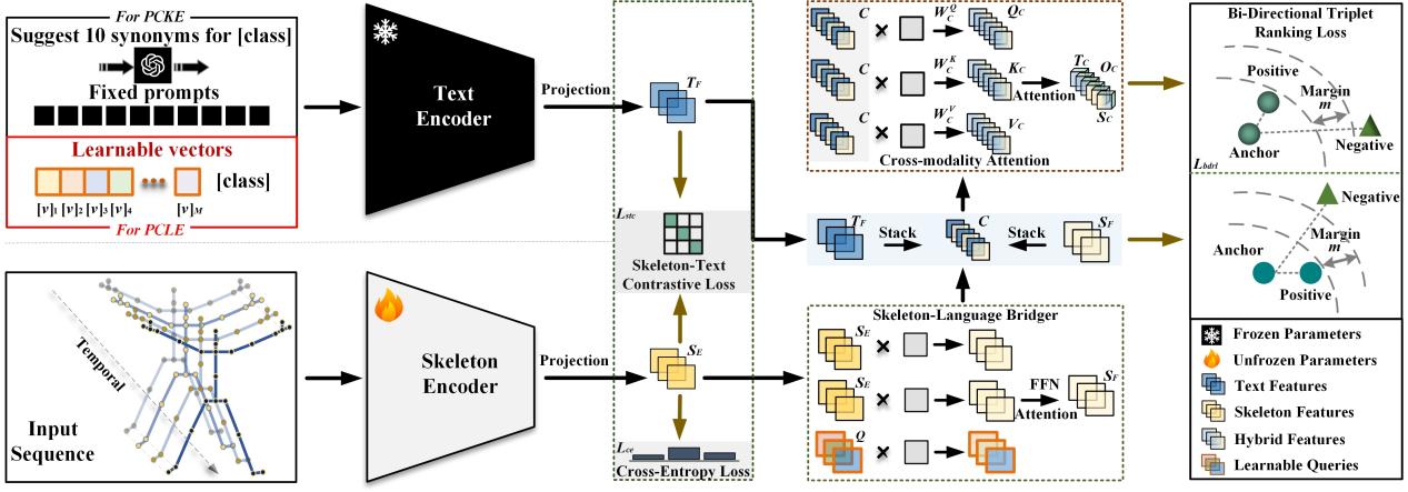 The pipeline of the proposed prompted contrastive skeleton-based action recognition framework is shown in Fig. 1, including two alternative implementations: PCKE and PCLE. In PCKE, the text encoder takes fixed synonymous descriptions generated for each action category as prompts, while in PCLE the prompt context is replaced with learnable vectors that can be optimized during training. After the skeleton sequence and the corresponding text prompt are encoded by the skeleton encoder and the text encoder, a skeleton-language interaction module is introduced to improve feature alignment between the two modalities. This interaction process contains two key components. First, a skeleton-language bridger extracts language-aware skeleton representations through cross-attention. Then, a cross-modality attention module further fuses skeleton and text information to enable deeper knowledge transfer across modalities. The whole framework is trained with classification supervision, skeleton-text contrastive supervision, and a ranking objective that encourages better alignment of skeleton and text features both before and after the interaction process.
